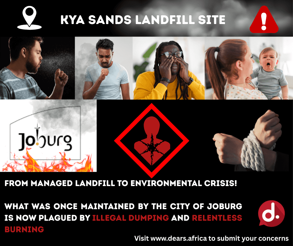 Communities in Kya Sands, Fourways, Bloubosrand, Chartwell AH, Farmall AH, and surrounding areas are being exposed to toxic smoke from the illegal burning of waste — including tyres, plastics, e-waste, chemicals, and even medical waste. These fires release hazardous fumes that poison the air, contaminate the soil, and threaten lives with asthma, respiratory illness, cancer, immune suppression, and developmental disorders.